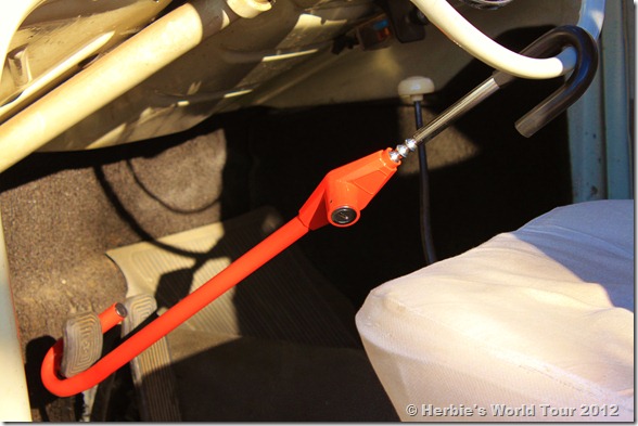 Today Domi bought a steering wheel pedal lock at a local auto part store for our trip to Mexico and South America. If somebody wants to steal Ocho, he would be still able to do so but we want to make it more difficult. Hopefully everything will be fine and our Number 53 will return to the USA safely.