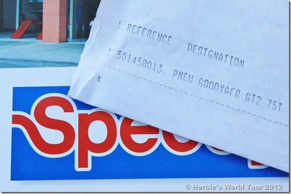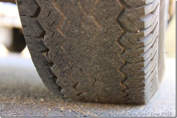 The tire on the passenger side is totally worn out and has deep cracks, so Domi arranged an appointment with a local tire service station where we’ll get two new ones.