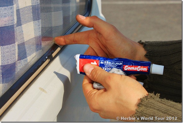 Finally Domi fixed the leaking window rubber seals of our camper “QEK Junior”. He used just simple transparent silicone he bought at the supermarket nearby.
