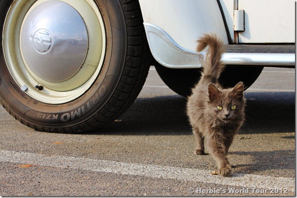 This cute little cat comes to visit us every day on our parking spot. Unfortunately it is hard to make her understand that we are vegetarians and we have nothing to offer.