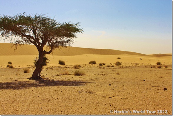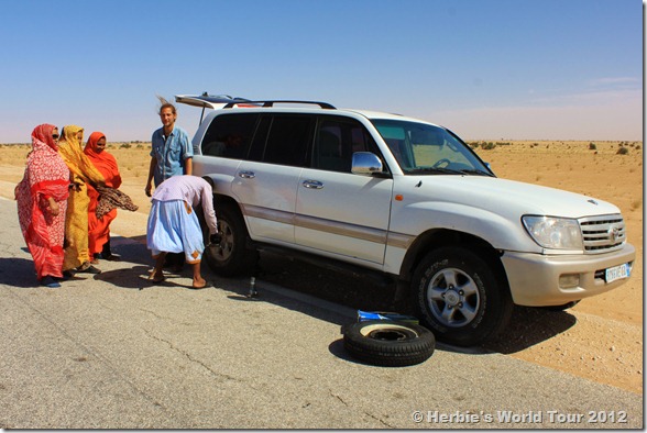 Another nightmare of touring across a desert is to have a car brake down. On our way through the Sahara, a Mauritanian family had a blow-out in the middle of nowhere. Though they were carrying a spare tire, they had no proper tool to lift their car. So, we stopped and helped changing tires by using our jack.