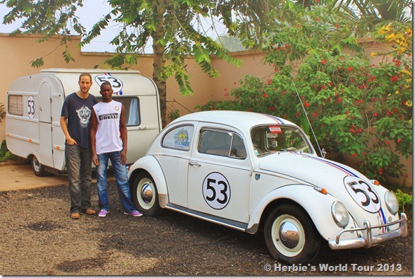 Somebody was cleaning the Love Bug! This nightly car wash went on for more than an hour. We didn’t want to interrupt the man at work, so we kept silent, while the guy got Herbie as well as our trailer, QEK, real shiny. In the morning we thanked the young man, who’s working for the hotel we were parking at (Hotel “La Solution”, right before Yaoundé) and gave him a generous tip. This was the first car wash since Morocco.