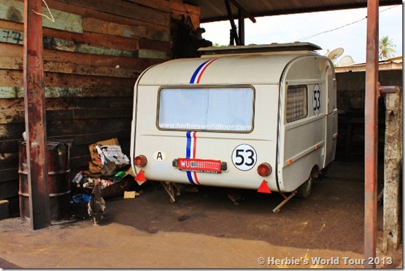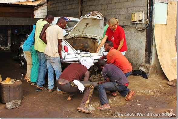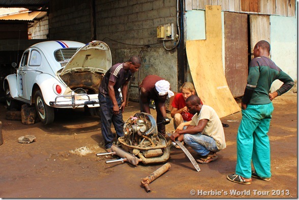 There was no car lift, so couple of men helped lifting the car bare-handed. Unfortunately the first gasket didn’t fit, so he had to pull out the motor twice. Now everything’s working great again and Herbie is ready to tour Gabon!