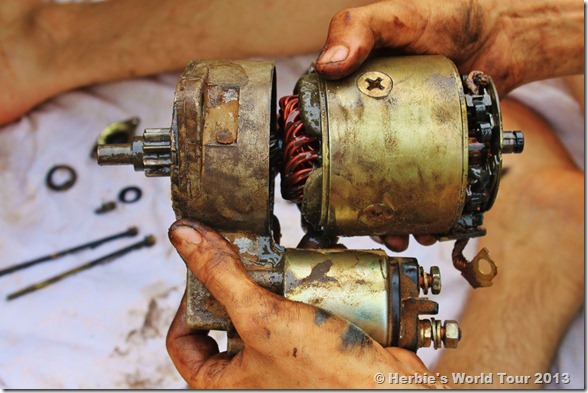We had to keep a cool head! Domi dedicated a whole day of work to repair the most important damages such as flushing the motor oil which included almost a quart of water, dismantling and cleaning out the mud of the starter as well as changing spark plugs, distributor cap and rotor.