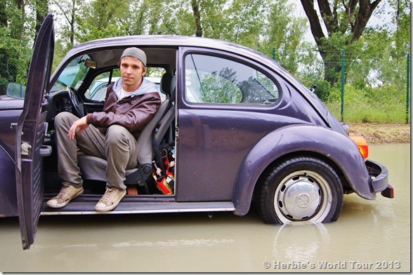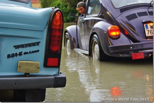 Although we are an “Aircooled Community”, we couldn’t avoid coming across water on the streets of Eastern Austria. As Herbie is tucked away safely on a hill, we’re driving “Trabi” these days. Herbie encountered enough “watering obstacles” on his way round the world. Yesterday Domi and his friend Flo (from DLV) inspected some local flooded roads.
